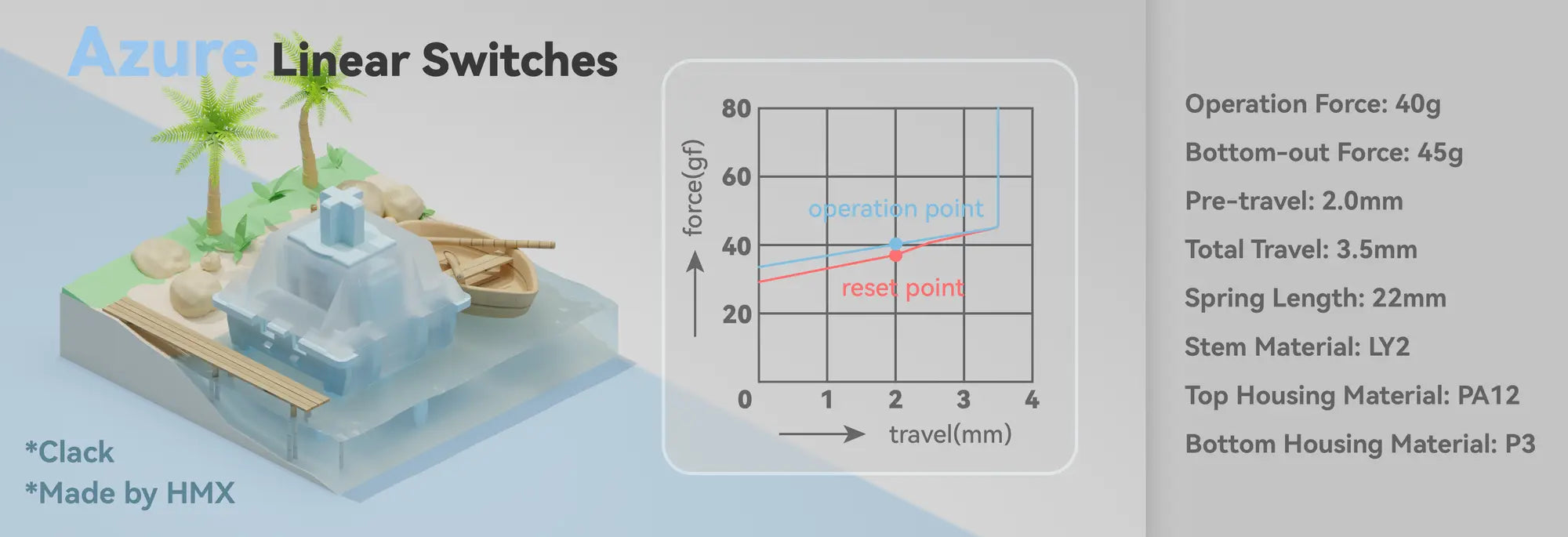 The Azure Switch has a crisp and refreshing sound. Paired with an FR4 plate, it provides a clacky and satisfying sound profile.