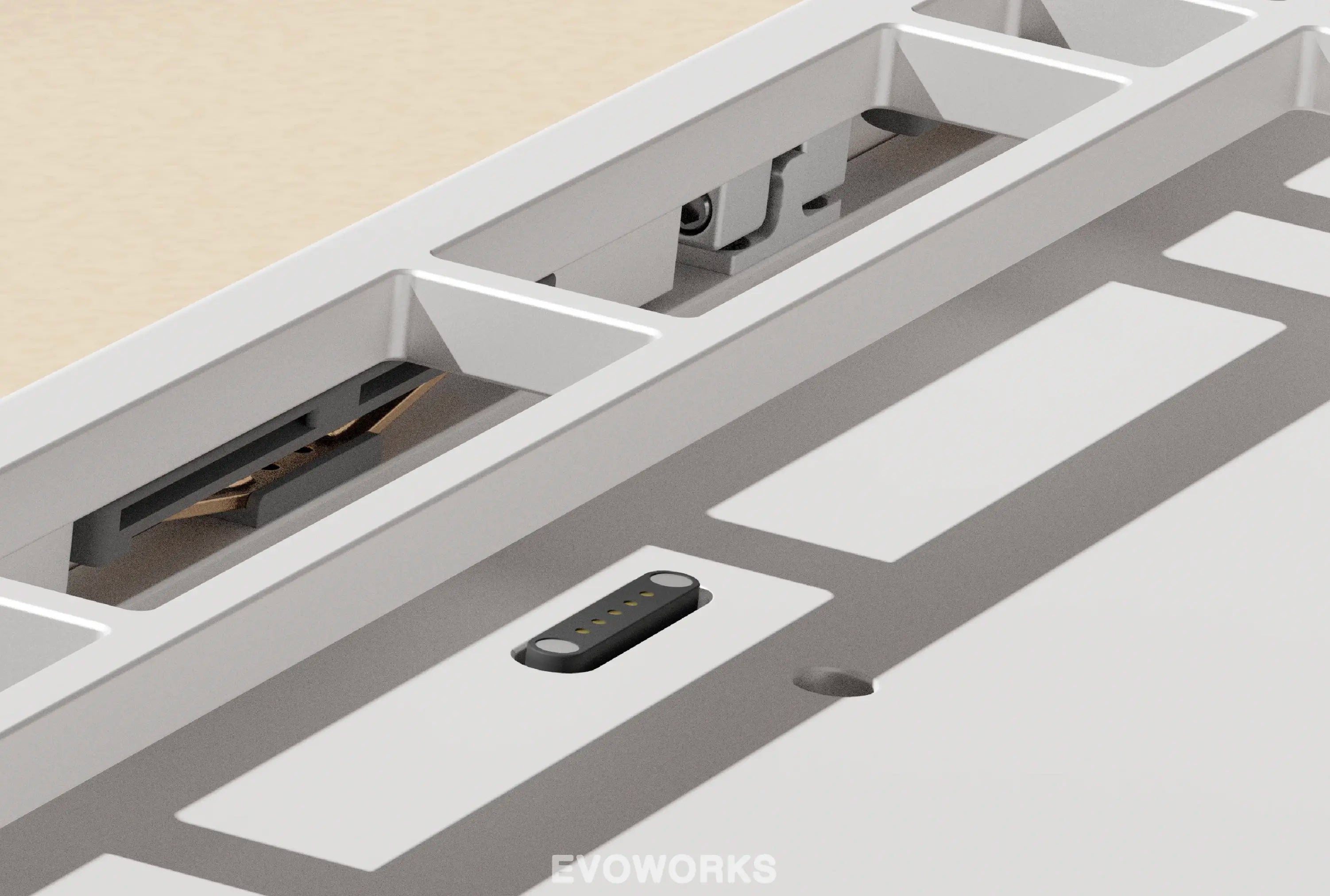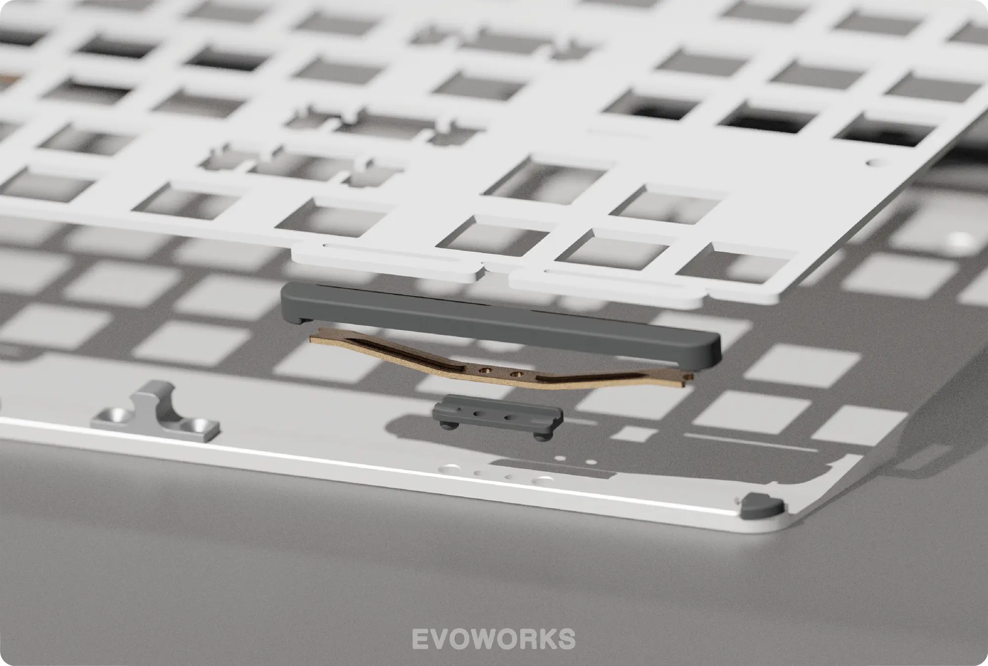 Typically utilised on high-end mechanical keyboards, the leaf spring structure implemtented on the Evo80 provides a more balanced and stable typing experience. The gaskets provide cushioning between the leaf spring and plate eliminating hollow sounds.